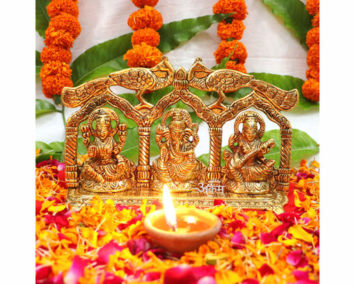 We at Parashara, under the name Arkam tend to provide you with the best quality Puja products in the most appropriate form.Goddess Mahalakshmi is also referred to as Dhan Lakshmi. This miraculous powers of Goddess Lakshmi can transform all your losses into profit. Worshipper of this Goddess Lakshmi never face any financial crisis in future. Worshipper gets freedom from all obstacles and achieves success and prosperity in all aspects of life.Lord Ganesha is the God of wisdom who removes all the obstacles that stand in your way of success. Offering prayers to Lord Ganesha to remove obstacles is a customary practice before undertaking any task. This ensures that a particular work or project moves forward successfully. Lord Ganesha infuses sacred energy to the worshipper to focus and accomplish goals and enhances positive spirits and stimulates confidence-level to succeed in all efforts.Goddess Saraswati is known for wisdom, education, intellect and speech. Everybody needs to enhance their knowledge through various ways like academic pursuits, private study of religious/spiritual treatises etc. Goddess Saraswati helps to attain all these. Worshipping Goddess Saraswati enhances the knowledge, improves concentration and memory power and performance in the examinations. She is also referred to as Vak Devi (goddess of speech) and Sakala kaladhishtatri (goddess bestowing all the arts), therefore, devotees are blessed with an understanding of music, dance and other creative arts and are enabled to achieve proficiency in them.This staute of Lakshmi Ganesha Saraswati helps the worshipper attain wealth, happiness, success and wisdom. Its blesses with all-round prosperity.