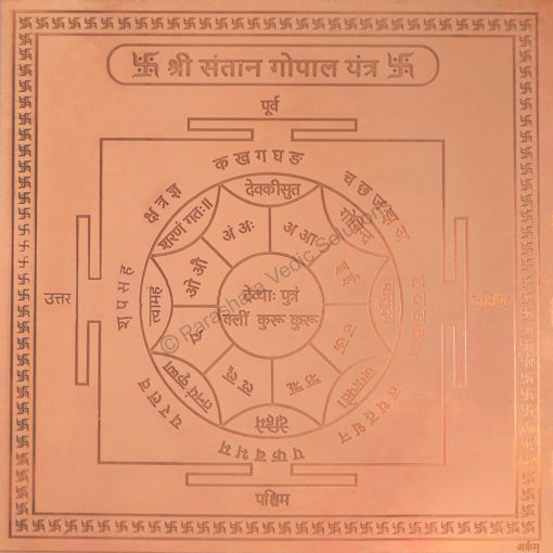 Deity: Lord Krishna, Laddoo Gopal (Childhood of Loard Krishna) Benefits:: This Yantra blesses the couple with a beautiful and intelligent child and increases love between them. This is a very useful Yantra for childless couples and boosts progeny prospects.It is primarily worshipped for safe progeny, protection to the children and their better health. All your prayers for offspring would be answered through this Yantra. Santan Gopala Yantra provide protection against miscarriage during pregnancy.