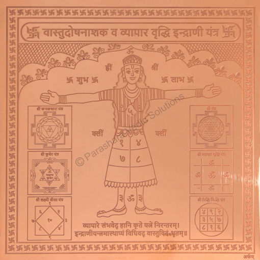 Benefits::Vaastu Dosh Nashak Vyapaar Vriddhi Indrani yantra is powerful enough to remove bad influences and ill effects of vaastu faults/defects existing at home, office or factory on business activities. On installation and energisation, the yantra not only removes almost every general fault pertaining to construction level Vaastu but also helps overcome from certain natural faults viz. direction of building, location, situation of a structure, surrounding structures and other fundamental vaastu faults that are not easily curable. The yantra helps to redure all inherent Vaastu faults, remove their ill-effects and generates positive energy. It can be installed at shop, office or factory premises in the pooja room. The yantra also bestows the worshipper with increase in sales, production, turnover and profits in business or profession. This yantra also bestows with good fortune, prosperity and flow of money in business. It also protects the worshipper by diminishing all evil intentions of enemies and resolving business problems caused by external or internal influences.