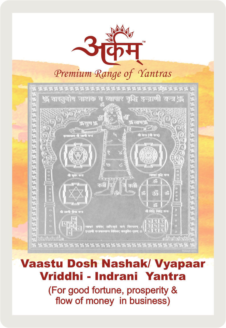 Benefits::Vaastu Dosh Nashak Vyapaar Vriddhi Indrani yantra is powerful enough to remove bad influences and ill effects of vaastu faults/defects existing at home, office or factory on business activities. On installation and energisation, the yantra not only removes almost every general fault pertaining to construction level Vaastu but also helps overcome from certain natural faults viz. direction of building, location, situation of a structure, surrounding structures and other fundamental vaastu faults that are not easily curable. The yantra helps to redure all inherent Vaastu faults, remove their ill-effects and generates positive energy. It can be installed at shop, office or factory premises in the pooja room. The yantra also bestows the worshipper with increase in sales, production, turnover and profits in business or profession. This yantra also bestows with good fortune, prosperity and flow of money in business. It also protects the worshipper by diminishing all evil intentions of enemies and resolving business problems caused by external or internal influences.